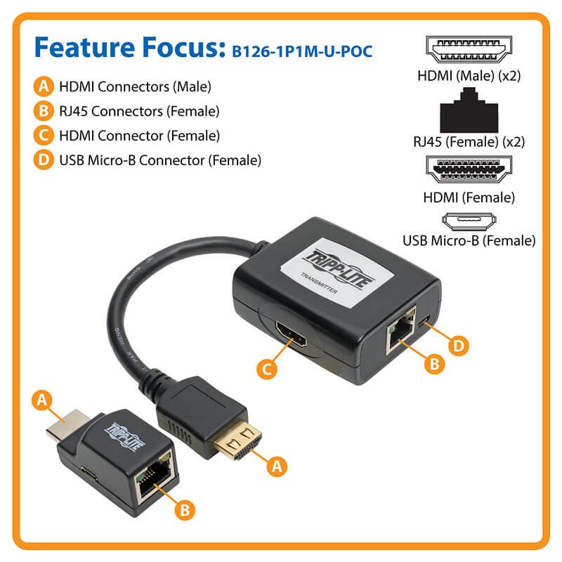 HDMI 通过 Cat5/6 扩展器套件、用于视频/音频的发射器/接收器、PoC、最长 100 英尺(30 m)、TAA