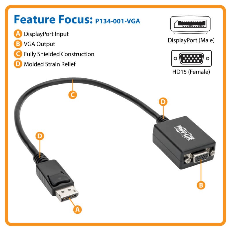 DisplayPort 到 VGA 主动适配器视频转换器,黑色 (M/F),1 英尺 (0.31 m)